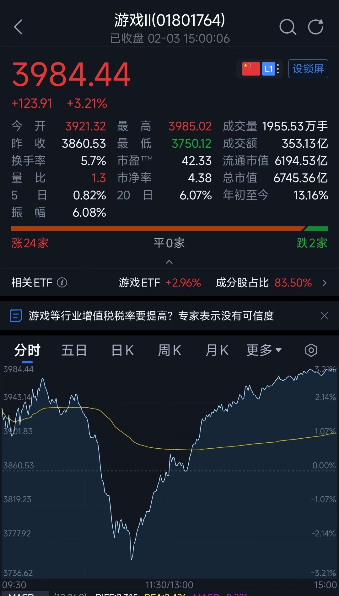 2月3日,A股游戏板块上演“过山车”,板块个股一度集体跳水,其中世纪华通股价跌幅超过9%,恺英网络、巨人网络、三七互娱等游戏企业股价同步下跌,游戏板块整体最大跌幅一度超过2.8%,随后板块跟随大盘开始回升,截至收盘,游戏板块上涨3.21%,其中顺网科技大涨13.8%,迅游科技、昆仑万维、完美世界等跟涨。而在港股方面,腾讯跌幅最大超过6%,收市下跌2.92%。