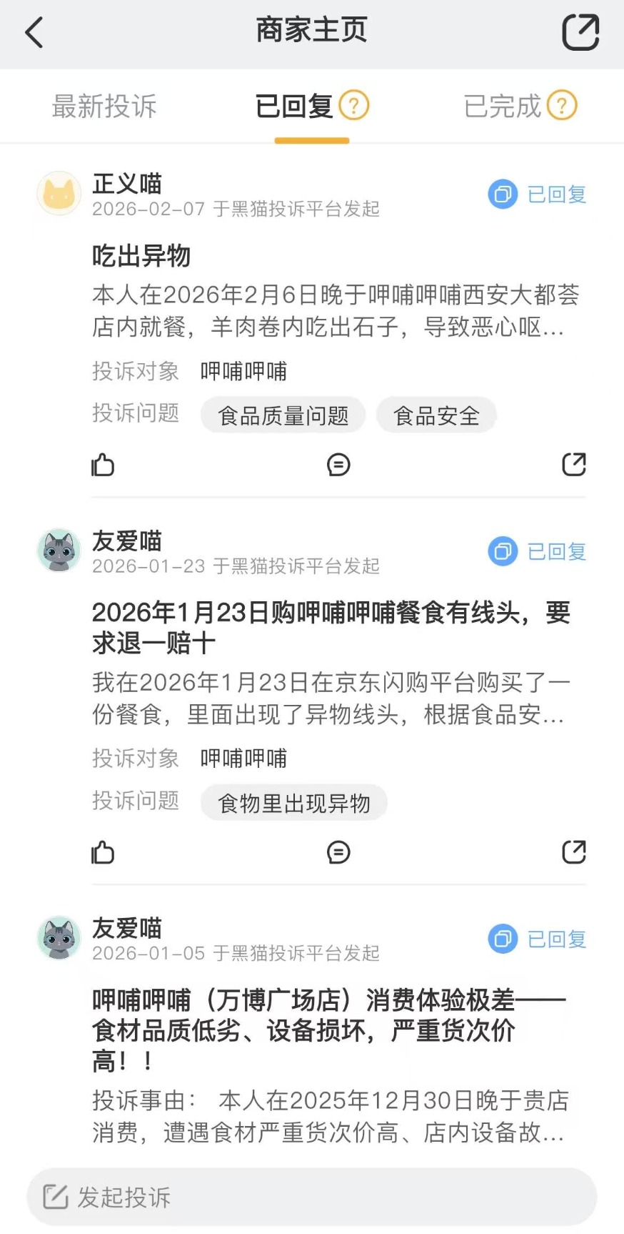 另据黑猫投诉平台,今年以来,呷哺呷哺外卖和堂食关于餐食有异物的投诉也是屡见不鲜。例如,有消费者投诉,2026年2月6日晚于呷哺呷哺西安大都荟店内就餐,羊肉卷内吃出石子,导致恶心呕吐无法正常工作;2026年1月23日在京东闪购平台购买的餐食里出现异物线头。