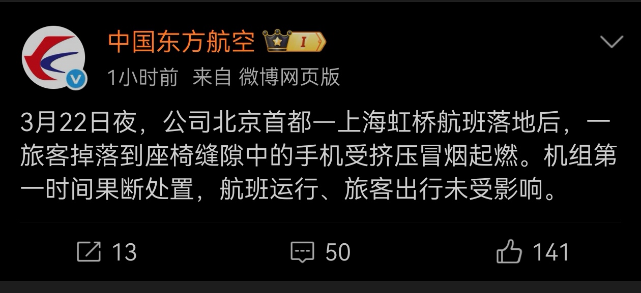 3月23日,东航发布通报称,3月22日夜,公司北京首都—上海虹桥航班落地后,一旅客掉落到座椅缝隙中的手机受挤压冒烟起燃。机组第一时间果断处置,航班运行、旅客出行未受影响。